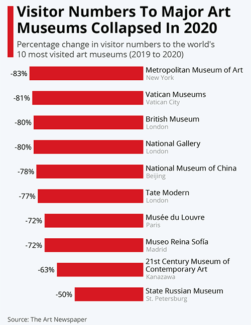 Otros grandes centros de arte y cultura sufrieron una fuerte caída en el mismo año. Por ejemplo el Museo Nacional de China, en Beijing, etiquetado como el segundo en cantidad de visitantes, recibió en 2020 un total de 1,6 millones de personas, es decir un 78% menos que un año antes.